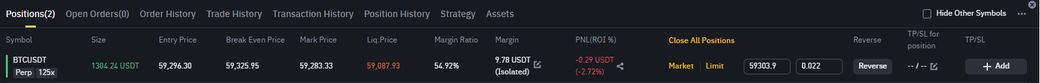 125배 레버리지를 사용해 거래할 때, 실제로 투자한 금액(여기서는 약 10달러)에 비례한 수익 또는 손실이 발생합니다. 그림에서 보이는 -2.72%는 전체 포지션(1304 USDT)에 대한 손익률이 아니라 투자한 원금(약 10달러)에 대한 비율입니다. 즉, -0.29 USDT 손실은 실제 투자 금액인 9.78 USDT의 -2.72%를 의미합니다. 레버리지로 포지션 크기는 크게 보이지만 손익은 실제 투자 금액을 기준으로 계산됩니다.