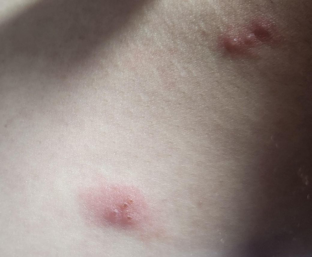 몇일 전 가평에 있는 글램핑장에 갔다왔는데 사진 처럼 가슴 옆이랑 겨드랑이 밑에 피부 발진이 올라와서 여쭤봅니다. 만지면 가렵기도 하고 옷에 쓸리면 따가워요ㅠ. 저 부위 말고도 등에도 생겼어요.. 원인이 진드기인지 궁금해서 여쭤봅니다