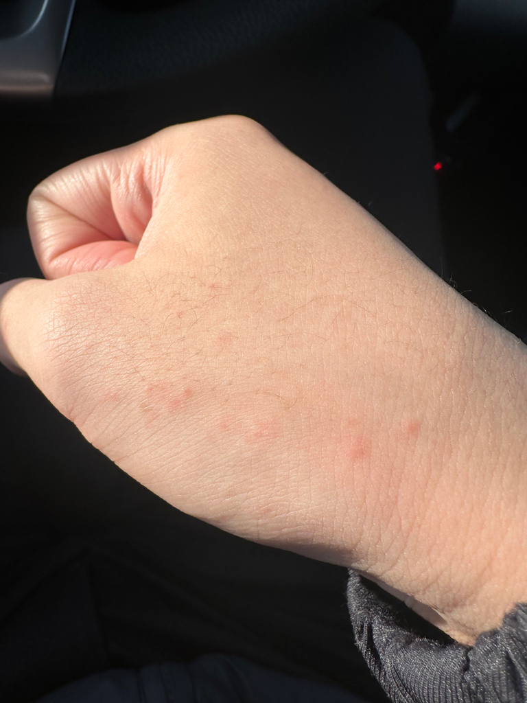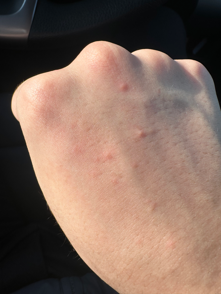 두드러기성 피부병변이 보이는 상황인데, 원인 파악을 위해서는 피부과 전문의에게 진찰을 받아보시는게 좋겠으니 가까운 병원을 찾아보시기 바랍니다.