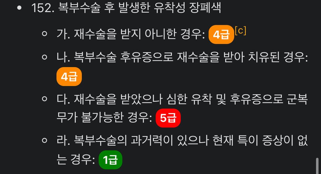 일단 어이가 없는데 사진의 (가)에 해당하는 판정을 받았습니다. 아마 병무청에서 제 자료와 커뮤니케이션이 잘 안된것으로 보입니다. 사실 저는 재수술을 받고도 3번의 장폐색이 일어났는데 이는 5급에 해당하는 조건이 아닌지 궁금합니다 이 점이 궁금하셨군요