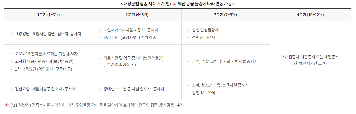 질병관리청의 코로나19 예방접종 계획에 따르면 백신의 공급과 접종상황, 연령과 코로나19 감염 위험에 따라 순차적으로 접종을 시행하며 대상군별 접종 계획 시기는 다음과 같습니다.