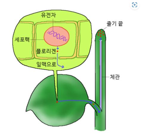 이 플로리겐은 세포 사이를 연결하는 구멍을 지나 잎맥으로 들어갑니다. 그리고 체관을 지나 줄기 끝으로 운반됩니다. 줄기 끝의 세포에 도달한 플로리겐은 세포 핵 안으로 운반됩니다.