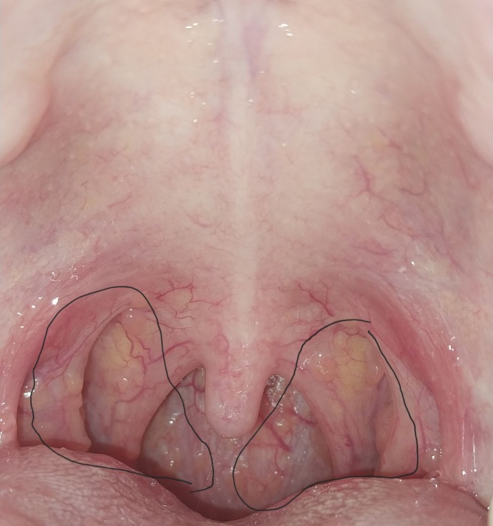 올려주신 구강 사진에서 인두 부위에 특이 소견은 관찰되지 않습니다.