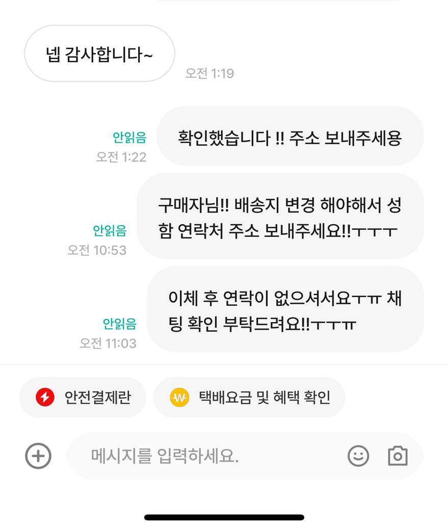 이체 했다는 말이랑 주소 답변이 없네요