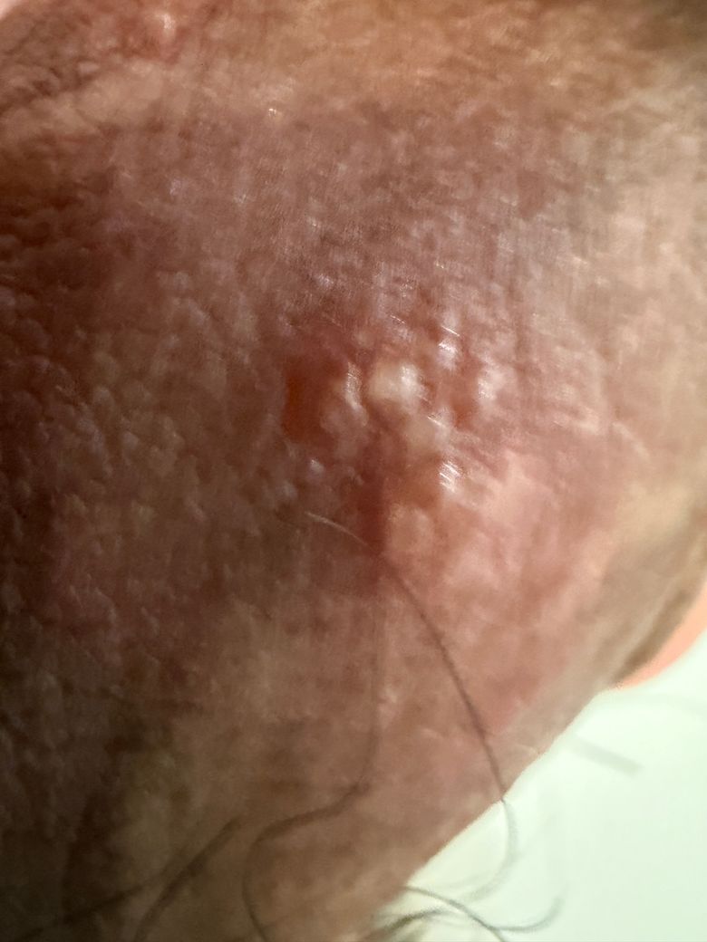현재 형태는 사마귀처럼 다발성으로 퍼지거나 표면이 거칠지 않고, 헤르페스처럼 수포나 통증이 두드러지지도 않아 성병 가능성은 낮아 보이나, 초기에는 완전히 배제할 수는 없습니다.