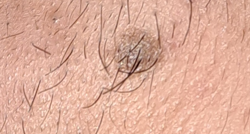 중심부가 융기된 사마귀 모양의 모반에 털이 자라난 모습은 복합모반의 특징적인 양상입니다. 복합모반이 의심스러우며 가까운 피부과에서 확인해보실 수 있겠습니다.