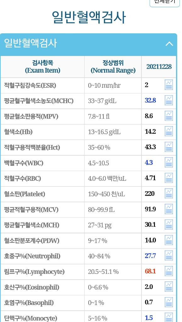 올려주신 혈액 검사에서 이상이 있는 부분은 특별히 문제가 되는 것은 아닙니다. 정상 범위보다 백혈구 수치가 약간 낮기는 하지만 바이러스 감염(감기나 장염)이 있을 때 일시적으로 나타나는 소견이랍니다. 호중구의 비율이 감소하고, 림프구의 비율이 증가한 것도 바이러스 감염을 의미하구요. 1달 정도 지나서 몸 상태가 괜찮을 때 재검사를 하면 괜찮아질 겁니다.