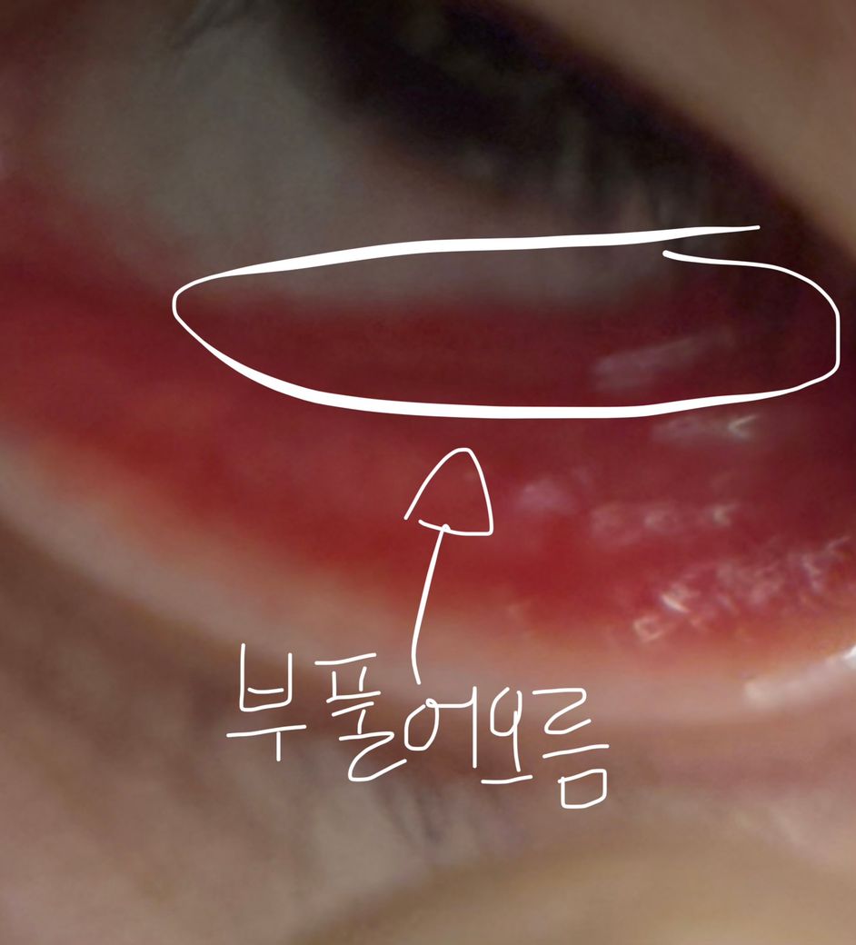 눈 안쪽 빨간살이 점점 위로 부풀어올라요;;