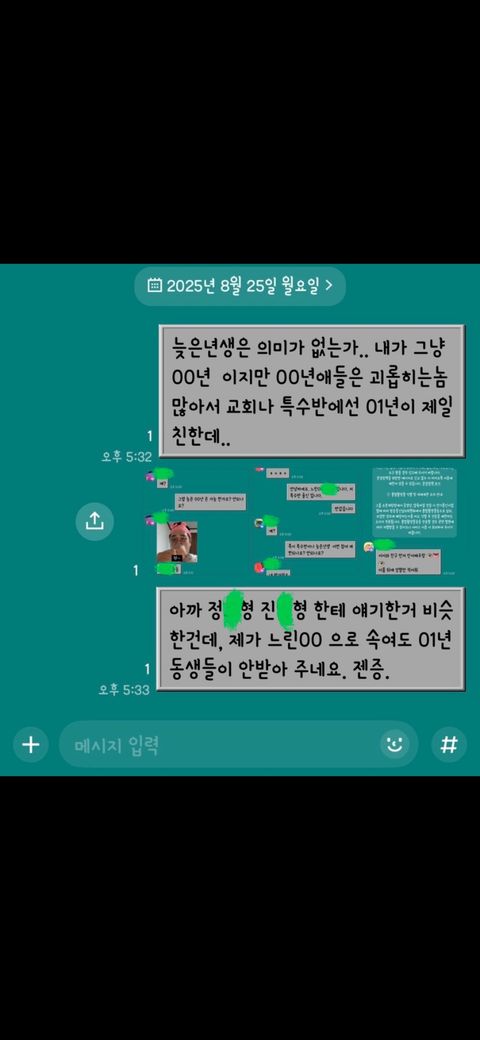 00년생 또래친구는 주로 학교에서 초중고 12년간 많이 괴롭혔고 그중에서 유독 8월생이 대부분 괴롭히고, 01년 동생들은 무시뿐 아니라 반면 형오빠대접 이나 잘해주는 애들도 있었습니다.
