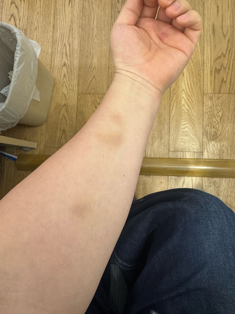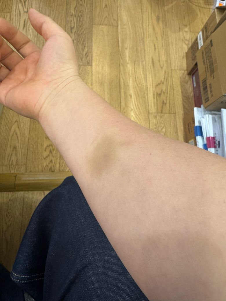 사진에서 보이는 병변은 팔 안쪽에 국한된 비교적 작은 피하출혈(멍, ecchymosis) 형태로 보입니다. 외상이 기억나지 않더라도 일상적인 미세한 압박이나 접촉(책상 모서리, 가방, 수면 중 압박 등)만으로도 발생하는 경우가 흔합니다. 특히 팔 안쪽은 피하 지방층이 얇고 혈관이 비교적 표층에 있어 가벼운 충격에도 멍이 생길 수 있습니다.