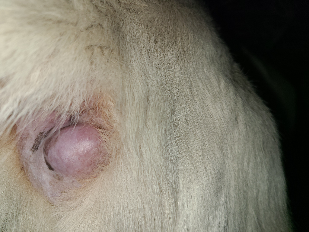 항문낭 파열 직전인지 또는 종양일 가능성이 있습니다.