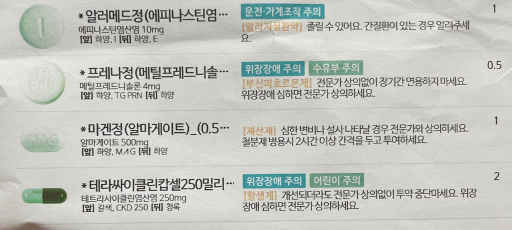 그리고 테라싸이클린과 마겐정을 같이 복용하면 테라싸이클린의 흡수율이 낮아지므로 만약 복용하게된다면 마겐정대신 다른 위장약으로 바꿔서 복용하세요.