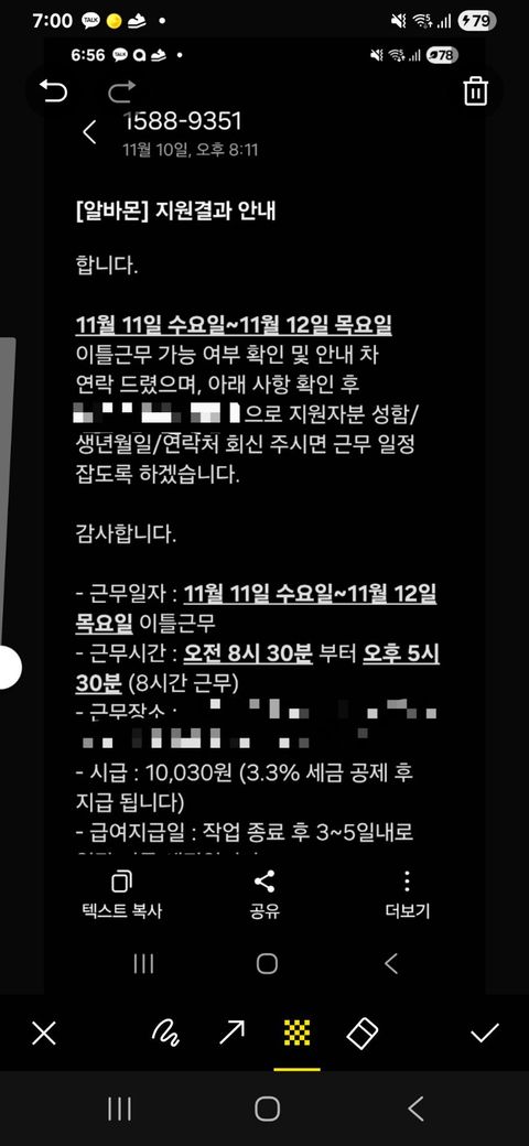 사전에 이틀 근무하기로 문자로 통보 받았습니다. 서면으로는 하루단위 어제까지로 되있어서 문자구두라 할지라도 계약 체결이 된거아닌가요?