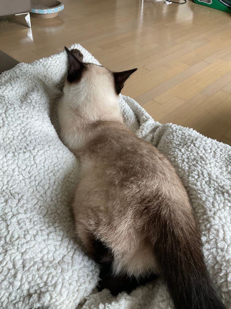 중성화수술을 한 것이라서 발정기가 온 것도 아닌데 이렇게 엉덩이를 보여 주는 자세는 특별한 경우가 아닌 것 같습니다 중성화 수술을 하지 않은 고양이 같으면 발정기가 되어서 이런 행동을 한다고 볼 수 있겠지만 이 고양이는 이미 중성화수술을 했기 때문에 발정기 하고는 전혀 무관한 것 같습니다 그저 편안한 자세로 누워 있는 것이 아닌가 생각됩니다