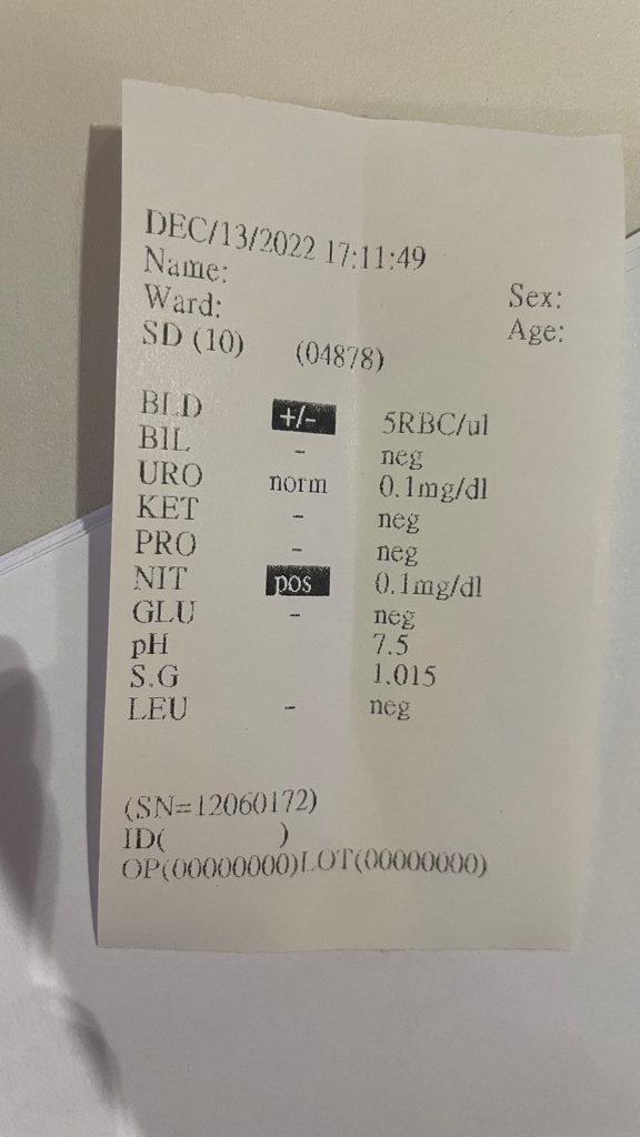 2. 요로감염의 경우 LEU라고 표시된 백혈구가 양성이 나오고, NIT라고 표시된 질소가 양성으로 나오는데, 특히 질소가 양성으로 나왔으므로 요로감염의 가능성이 충분히 있어 보입니다.