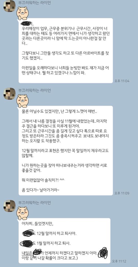 거기 알바생들이 다 있는 자리여서 집 와서 연락 드렸늗데 저렇게 답이 오셨는데 전 사장님한테 그만 둔다는 소리 한 적 없고 2월 말이나 아니면 계속 한다고 했거든요 근데 제가 같이 일하는 알바 동생이 저랑 친한데 제가 11월쯤에 아마 그만두고 다른 곳 갈 거 같다 얘기를 했었는데 설마 그걸 말했나싶기도하고