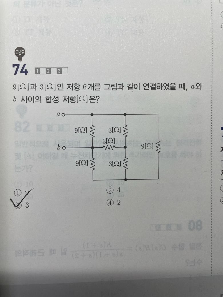 a와 b사이에는 9Ω, 9Ω, (3Ω+3Ω)=6Ω, 오른쪽 9Ω이 병렬로 연결된 형태가 되고, 이를 합성하면 전체저항은 3Ω이 됩니다.