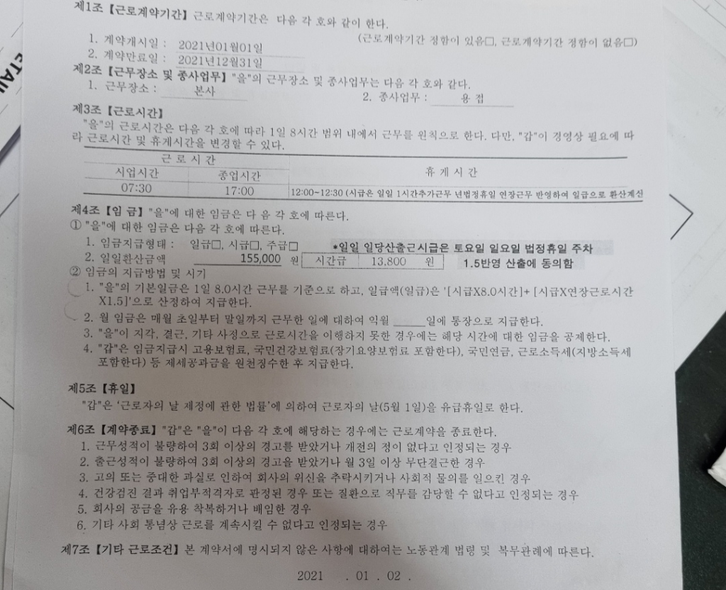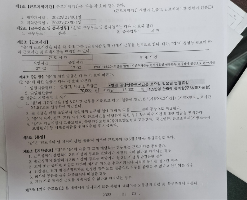추후 근로계약서 교부 요청도 거부하고 월급 명세서에는 일급만 계산되어서 다른 법정제수당을 받기 위해 노동부에 진정 신고를 하였는데요. 신고 후 사장이 근로계약서를 보내줬습니다.