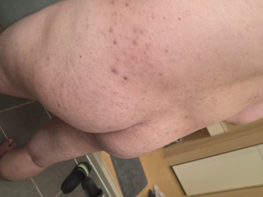 사진과 설명을 종합하면, 일반적인 얼굴 여드름보다는 엉덩이·허벅지 부위에 흔한 모낭염 양상이 더 의심됩니다. 특히 털이 있는 부위에 크기가 비교적 균일한 붉은 구진들이 다발성으로 분포하고, 면포(블랙헤드·화이트헤드)가 거의 보이지 않는 점이 특징적입니다.
