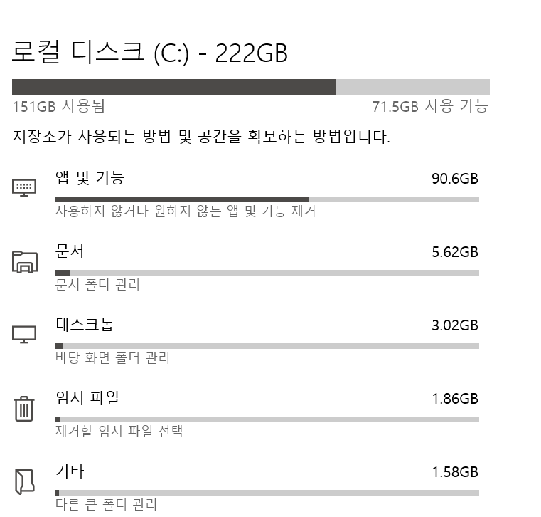윈도우 키 누르시고 설정에 들어가셔서 시스템 누르신 후 저장소를 누르면 나옵니다.