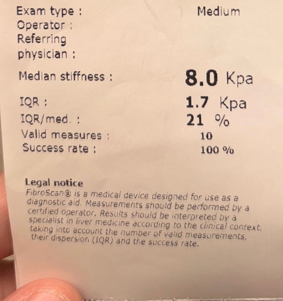 검사 결과 값만 가지고 해석하는 것은 다소 제한이 있으나 일반적으로 결과 값이 2 kPa ~ 7 kPa인 경우 정상 값으로 8 kPa라면 섬유화 동반 가능성이 생각됩니다.