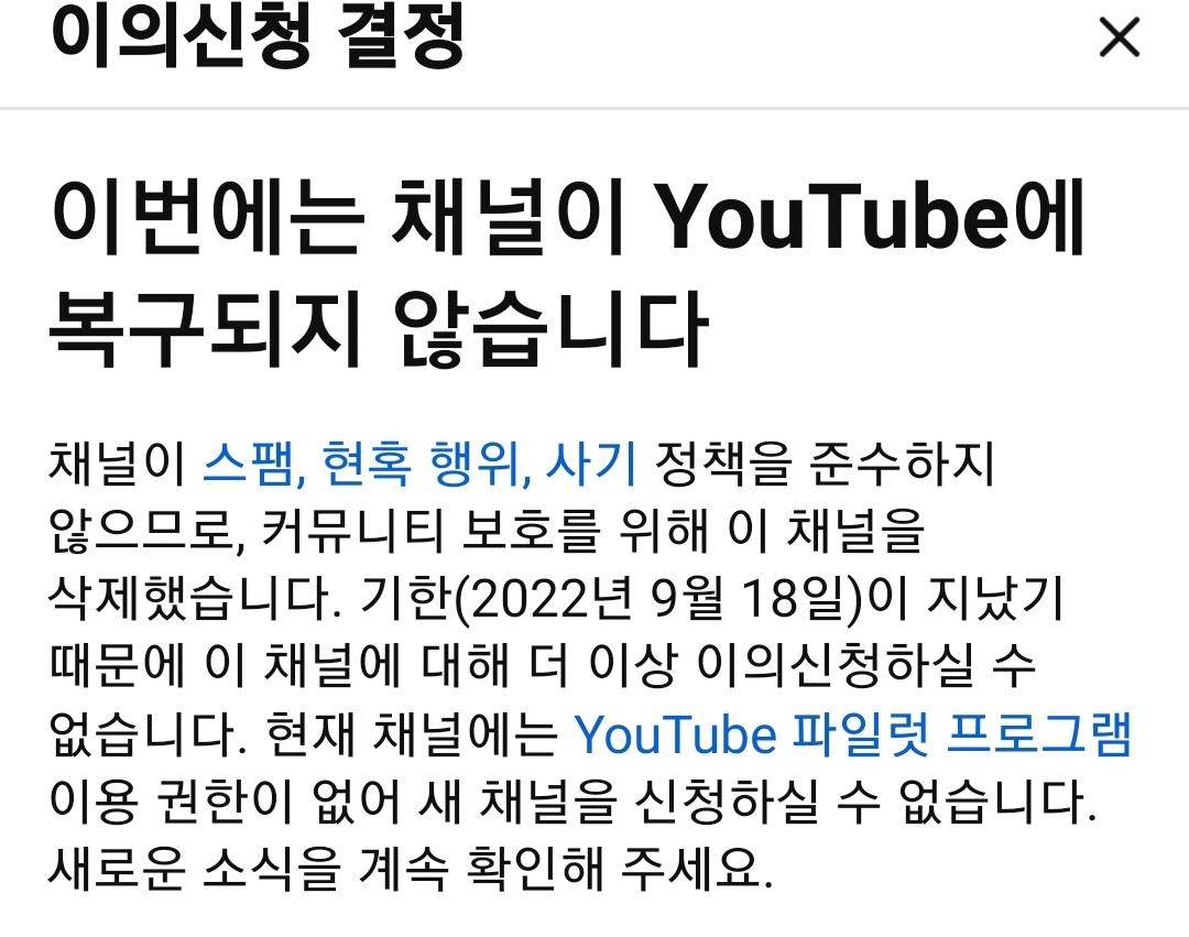 유ㅌㅠ브 영상보다가 갑자기 "이번에는 채널이 유튜브에 복구되지 않습니다"라는 문구가 뜨더니 영상보는게 안되요 어떻게해야 하나요?
