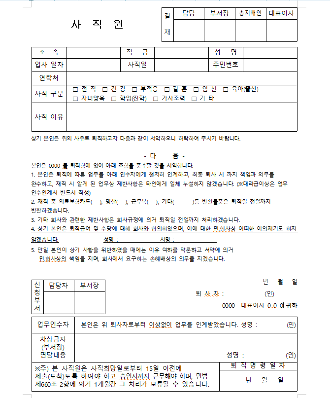 1. 사직에 관한 문의로 사료됩니다.