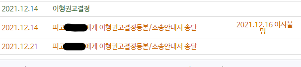 2021년 12월 14일에 송달된 내역은 2021년 12월 16일 이사불명으로 나왔습니다.