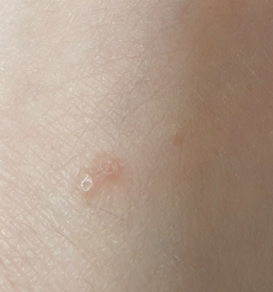 사마귀가 의심스런 피부 소견은 아닙니다. 사진의 소견으로 보았을 때에는 피부의 상처가 생긴 뒤 딱지가 발생하였다가 떨어진 상태로 보입니다. 경과를 지켜보아도 무방할 것입니다.