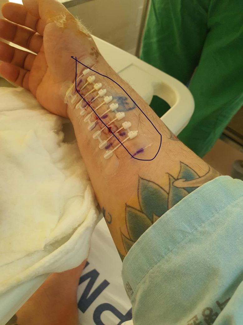봉합 부위에 쓰인 것은 피부 봉합용 스티리-스트립(봉합 테이프) + 외부 고정장치류로 보입니다.