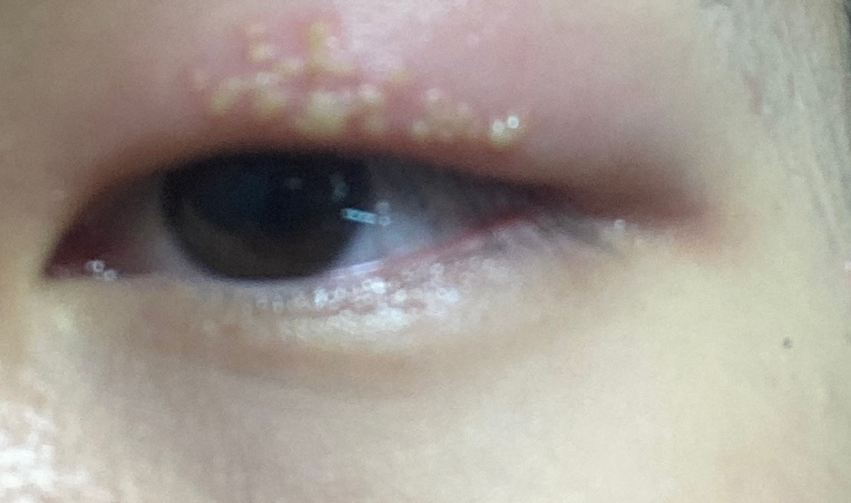 피부에 수포성 병변이 동반된 것 같은데 다래끼에서는 관찰하기 어려운 증상입니다. 가까운 피부과를 다시한번 방문해보시길 권해드립니다.