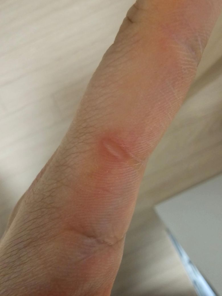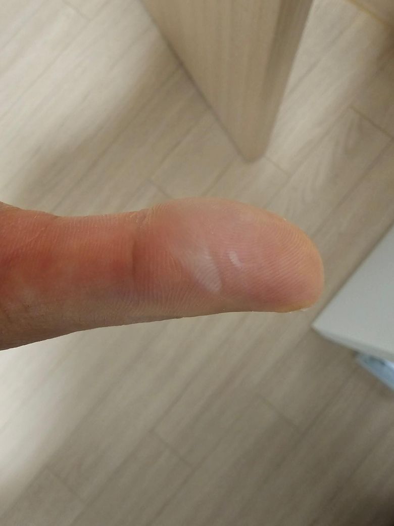 사진상 엄지 측면에 경계가 비교적 명확한 발적과 중앙부의 창백한 부위가 보입니다. 물집은 없고 접촉 시 통증이 경미한 상태라면, 현재로서는 표재성 2도 화상(superficial partial-thickness burn) 또는 깊은 1도 화상 가능성이 있습니다. 다만 중심부가 하얗게 보이는 경우는 국소 허혈이나 비교적 깊은 손상 가능성도 배제할 수 없습니다.