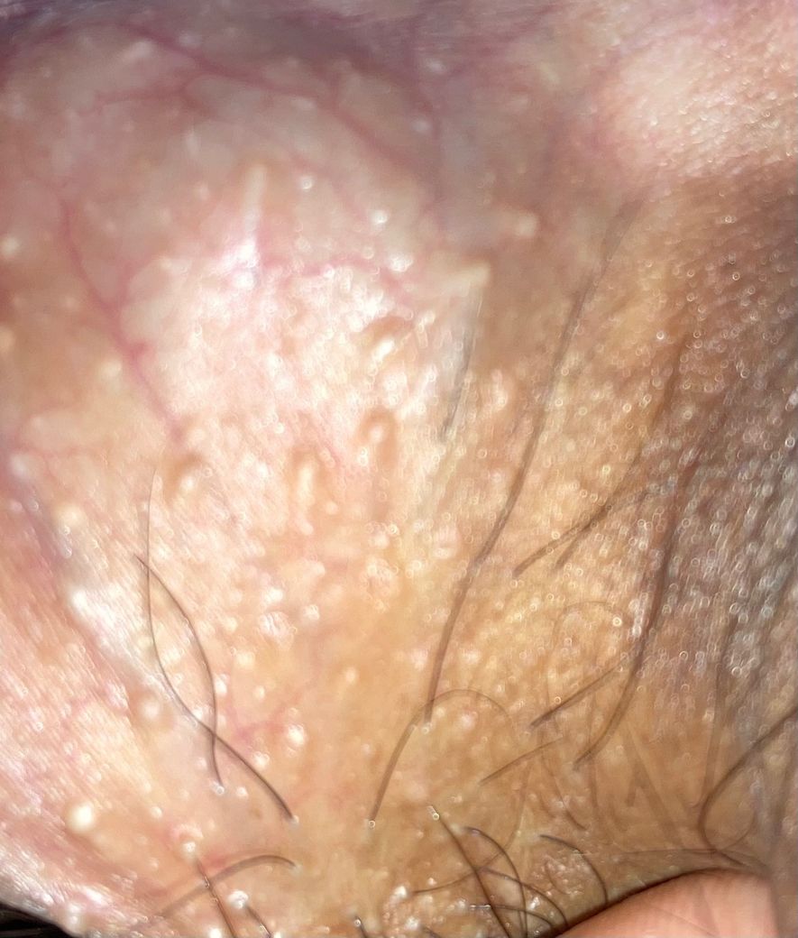 사진 소견은 포다이스 반으로 보는 것이 가장 타당합니다. 피지선이 피부 표면으로 드러난 정상 변이이며 성병과는 관련 없습니다.