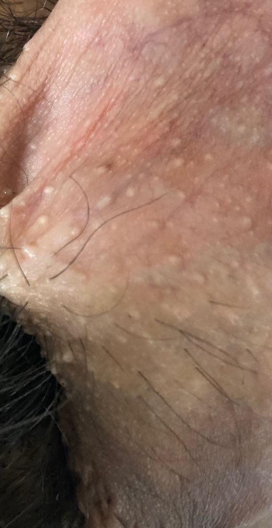 임상적으로 특징은 크기가 작고 균일하며 통증, 수포, 궤양 없이 안정적으로 유지되는 점입니다. 곤지름처럼 표면이 거칠거나 커지면서 융합되지 않고, 헤르페스처럼 통증성 수포나 궤양으로 진행하지도 않습니다.
