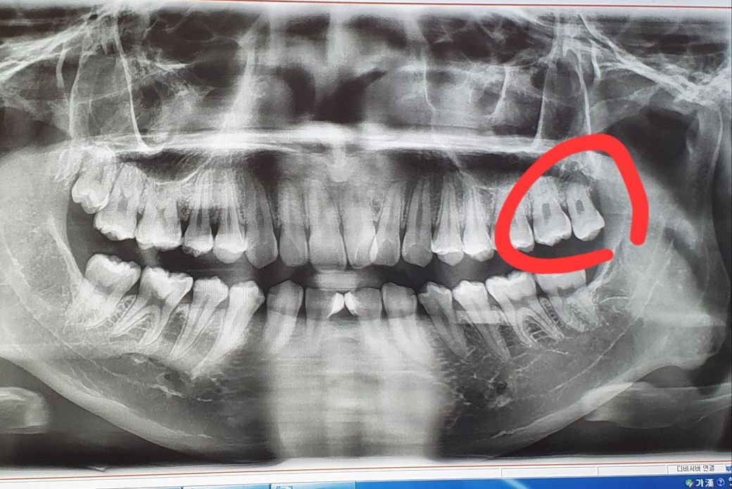 (좌우반전이라 아마 빨간부분 말고 반대쪽이 오른쪽 윗사랑니 같아요.)