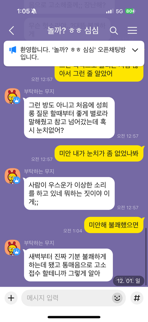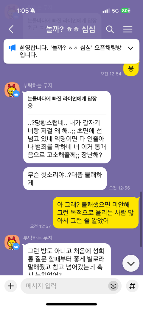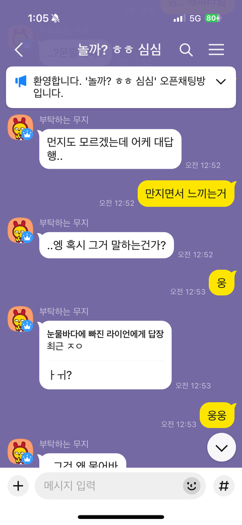 새벽에 뭐해 놀까? 라는 방을 들어가서 질문을 받는다는 제목에 저렇게 물어봤습니다 위에 사진 참고 해주시고 현재 방은 나간 상태입니다 친절한 답변 부탁드립니다