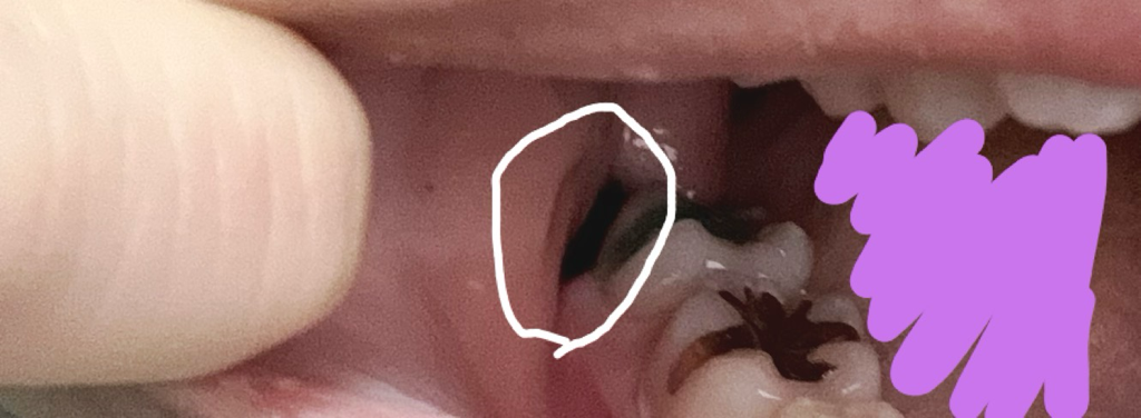 사랑니 발치부위에서 피가 나와서 검게 보디는 것으로 보입니다. 2-3일간은 피가 묻어나올수 있으며 나오는 피는 벧지 말고 삼키길 권하며, 일주일간은 염증이 덧나지 않도록 흡연 및 음주는 피하길 권합니다.