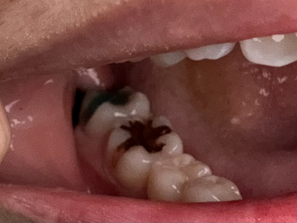 사랑니가 잇던공간이 그늘져서 까맣게 보이는거 같습니다. 음식물이 들어 갈수 있으니 식사를 하시고 나서 물로 여러번 헹궈주시는게 좋습니다.