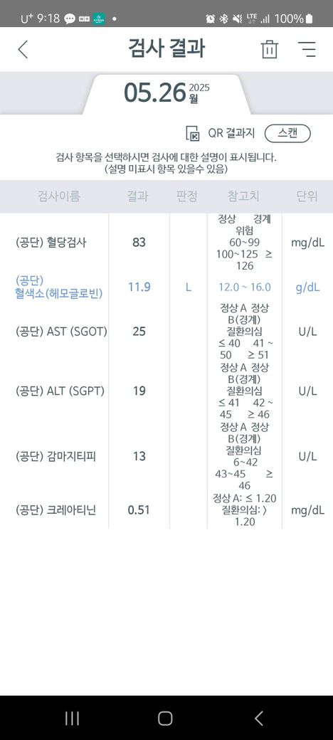 빈혈수치 11.9 정상치.약간 아래인데.재검 필요한가여??