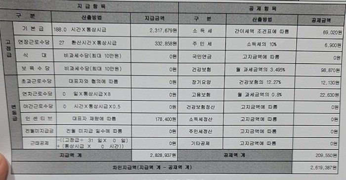 어느 연봉계산기를 사용하였는지는 모르겠지만 세전 급여인 2,828,937원에 대하여 4대보험료와 근로소득세 공제부분에