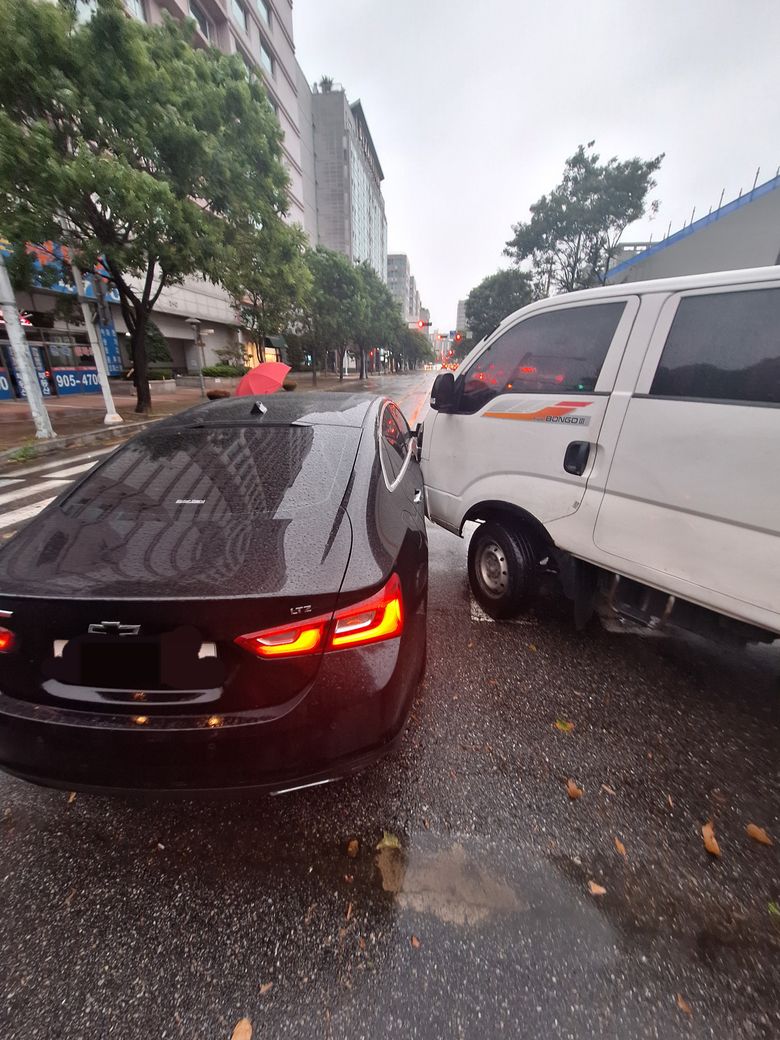 정차중인 상태에서 2차로진입하려던 트럭이 1차로로 차선변경하면서 조수석 문짝이 교체수준으로 들이받힌 상황입니다.