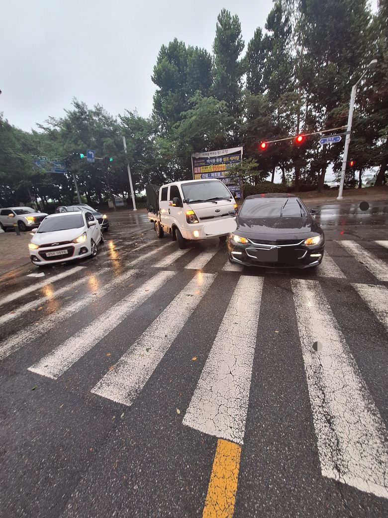 우회전대기중 차막힘으로 인해서 대우회전하여 1차로 진입하였는데, 2차로에 있던 트럭이 1차로로 차선 변경하며 조수석을 들이받았습니다.