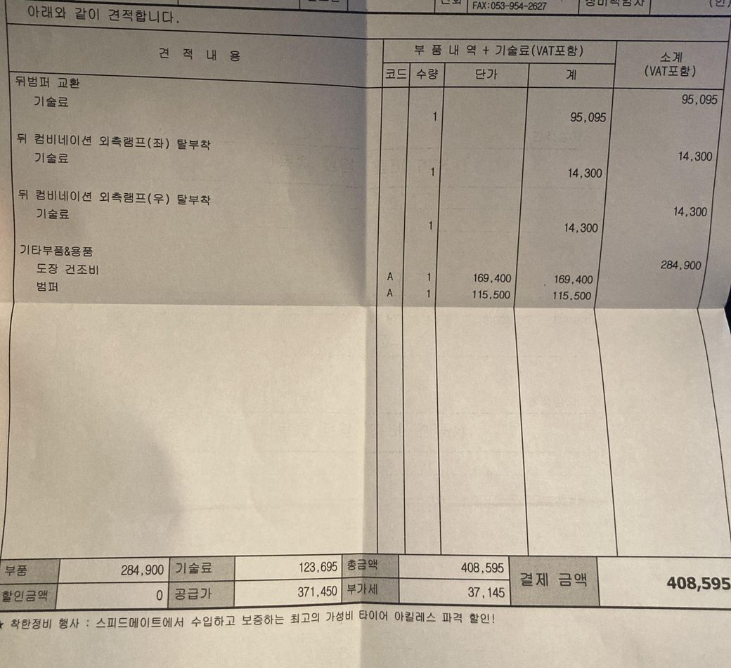 어찌되었든 업무 중에 나온거라 가까운 카센타에 차를 맡기고 복귀를 했는데, 다시 퇴근 후 카센타에 가보니 이미 가해자가 수리비를 현금결제하고 현금영수증까지 끊어 갔다고 하더라구요...?