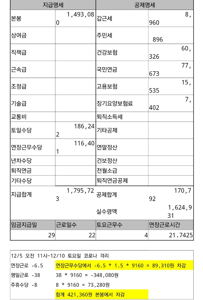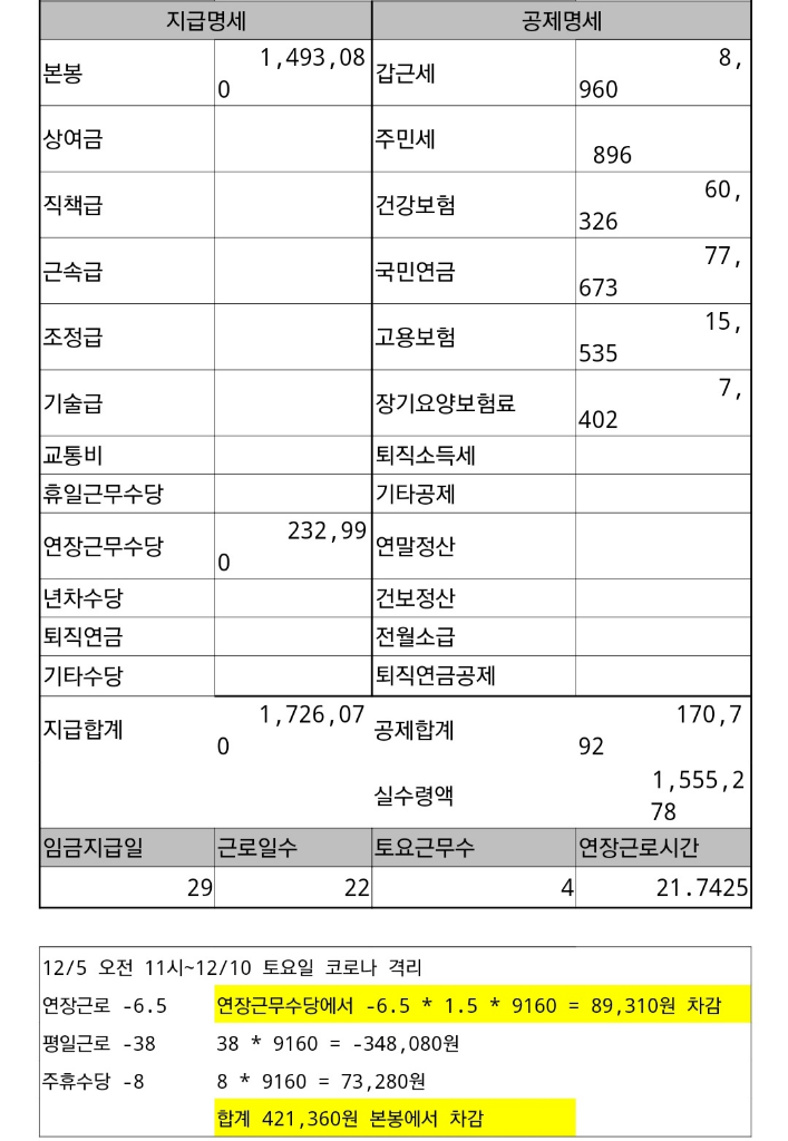 코로나 자가격리로 결근 시 월급 계산이 이게 맞나요?