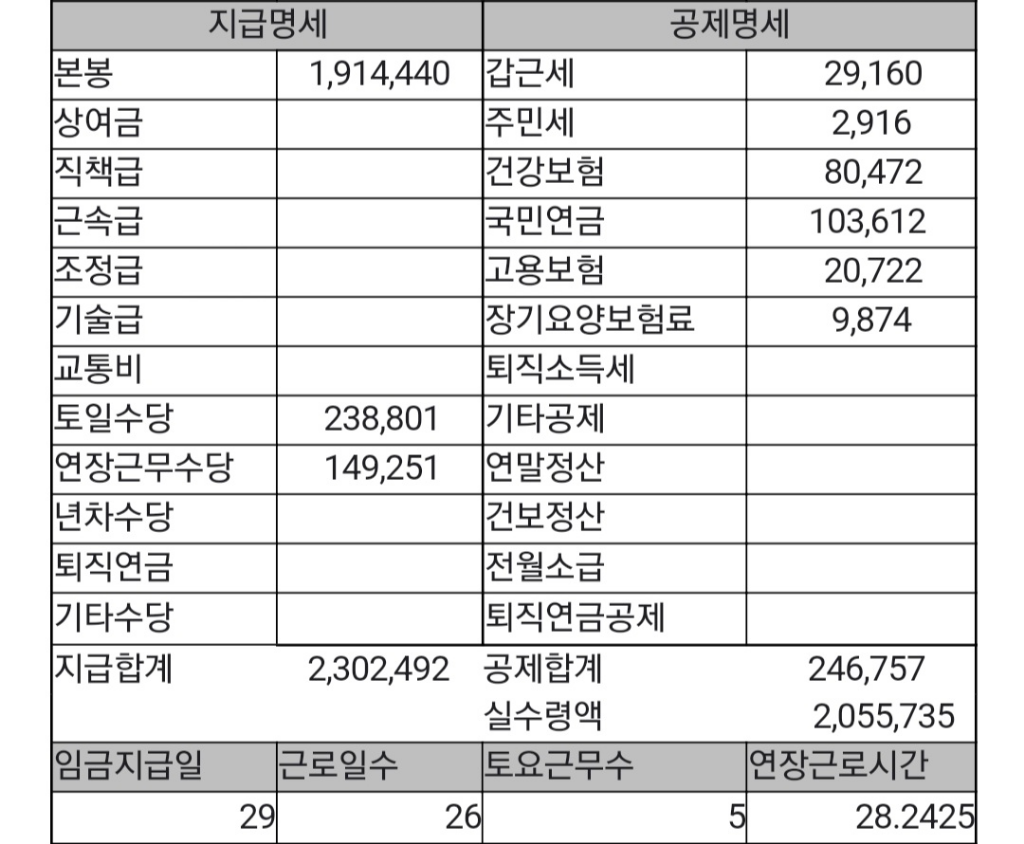 정상 출근 했을 때의 급여 명세서