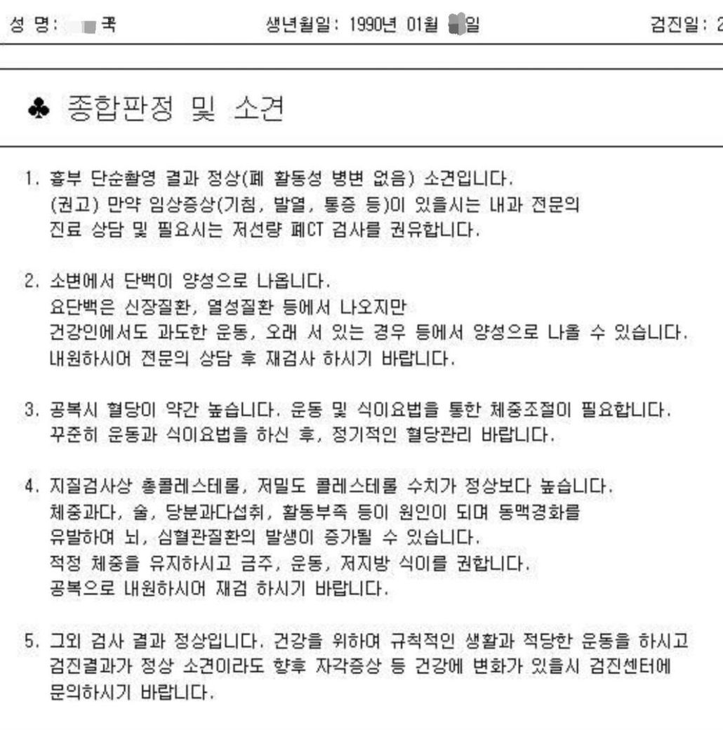 배치전 건강검진을 받고 결과를 받았는데 사진과 같이