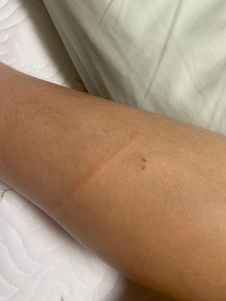 오늘 일어났는데 다리가 가려워서 안보고 긁었어요 긁고 나보니 사진처럼 가로로 긴 붓기같은게 생겼는데 무슨 증상인가요?????