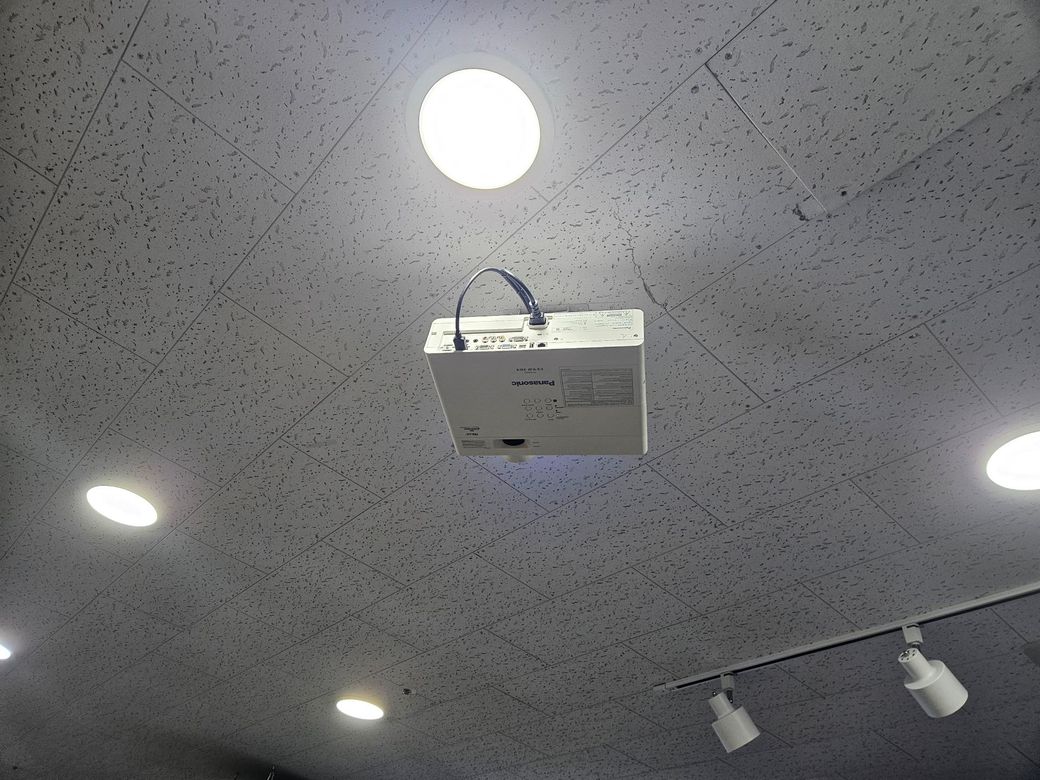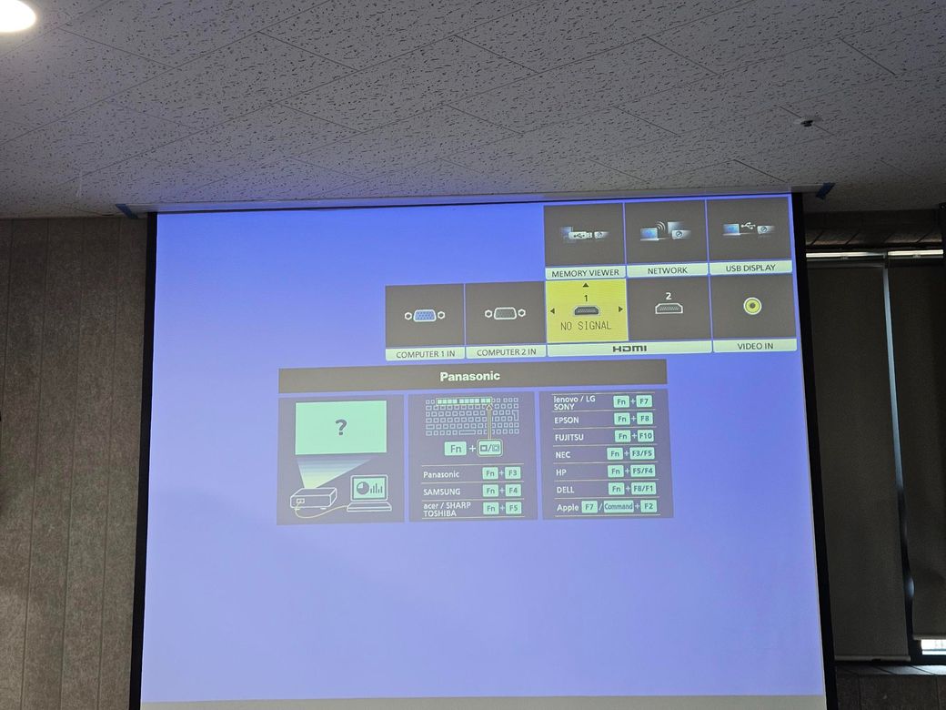 안녕하세요. 지금 기독교 단체 수련회 직전이고 지금 스크린에 빔화면이 나와야 하는데 사진에서 보시다시피 빔프로젝터는 공중에 달려있고(그래서 예배당 뒤편 모니터와 선을 연결하는 구조는 아닙니다.) 스크린화면은 계속 저 상태인데 이거 어떻게 해결해야 할까요?