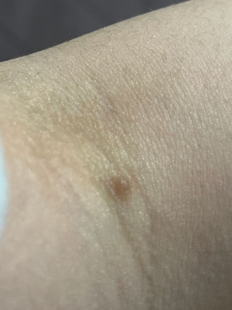 사진상으로는 주사 바늘 자체의 자국이라기보다 주사 후 생긴 국소 색소침착이나 미세한 흉터(섬유화 결절) 가능성이 높아 보입니다. 수면마취 주사 부위는 피하 출혈이나 염증 반응이 남으면서 갈색 점처럼 오래 지속되는 경우가 드물지 않습니다.