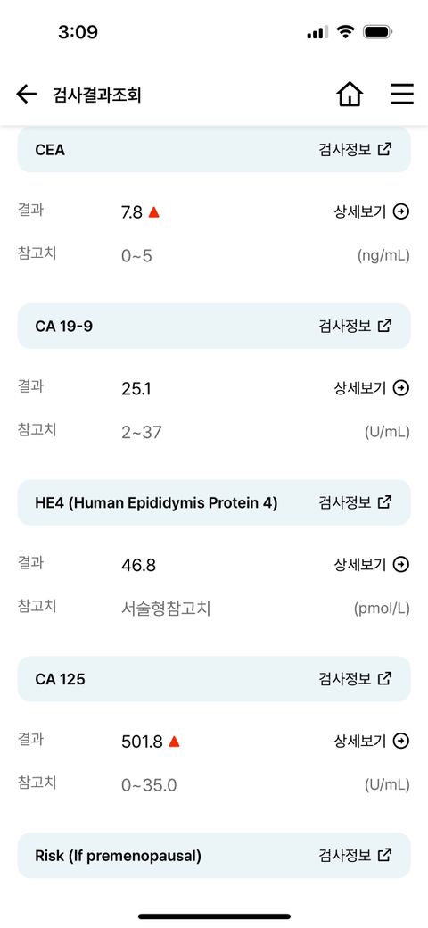 CEA 7.8 로 약간 이상하지만 CA125가 501.8로 매우 높습니다